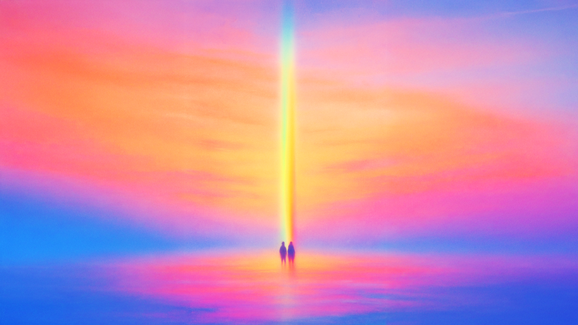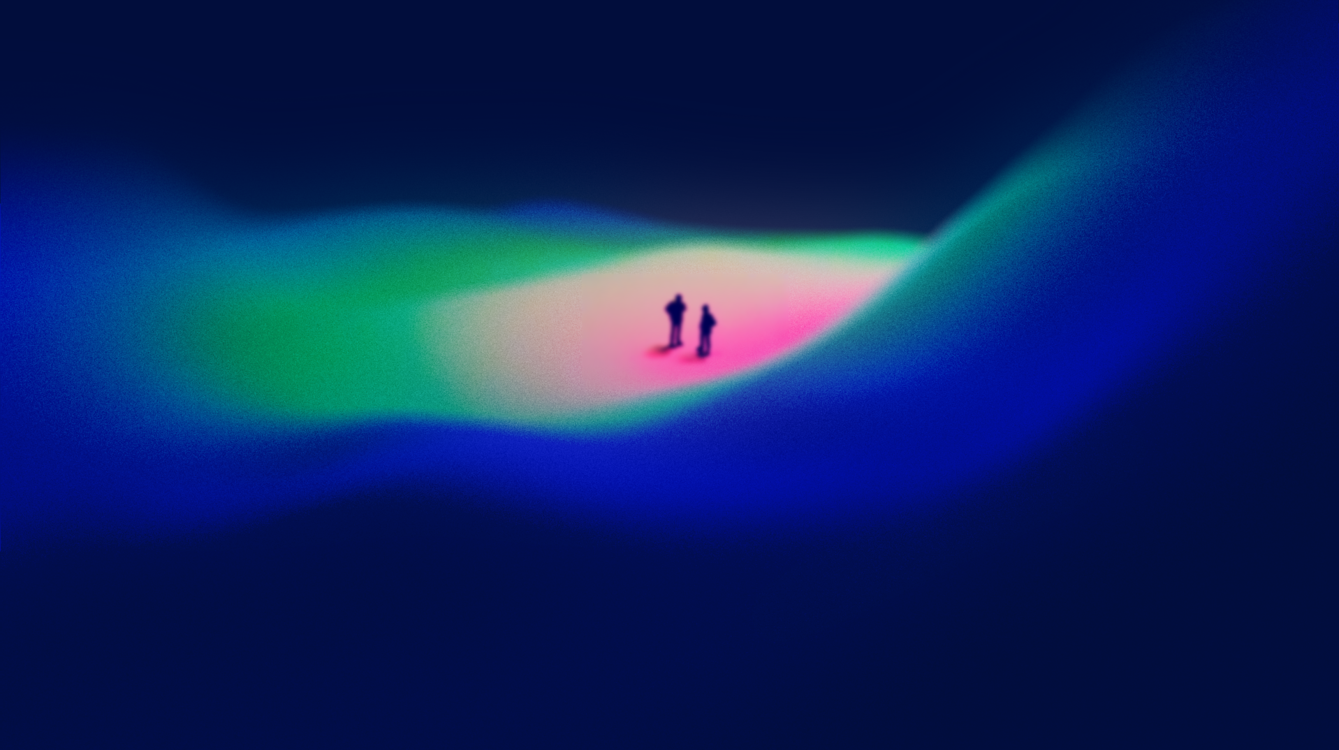 This is the world on the far side of the glass—the place the children already inhabit and the adults are only just beginning to sense. It is not built of objects so much as fields: soft pulses of color, drifting atmospheres, and shapes that hover between landscape and emotion. A mountain crest glows like a low-frequency beacon; two silhouettes meet at its peak and the air itself brightens, as though intention carries its own light.