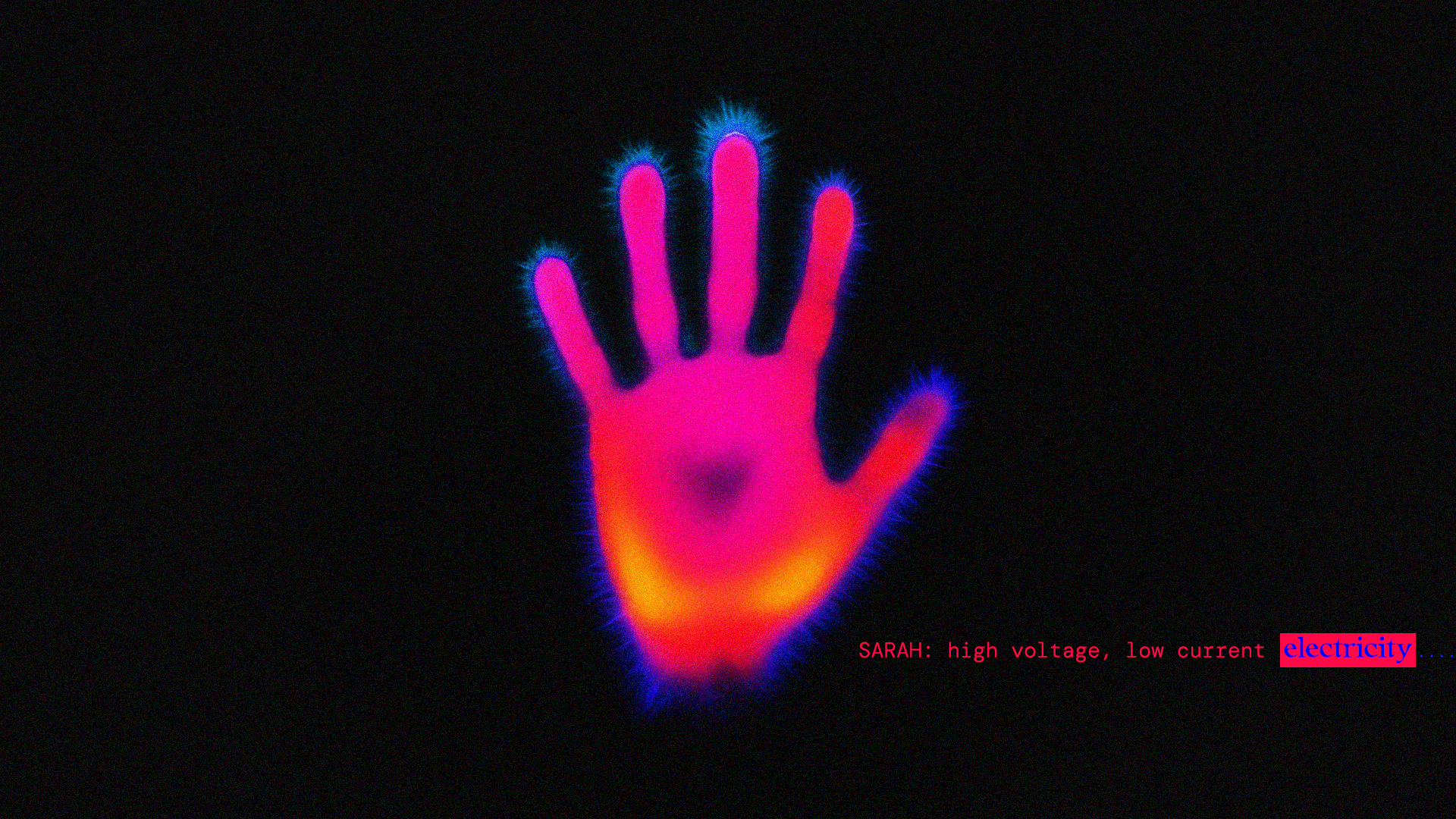 When the story needs precision we shift into the first of our three visual motifs, Electric Auras, our language for representing complicated concepts that need quick bursts of visual support, the way infographics might be used in a more traditional documentary. Against a pure black stage, subjects ignite with Kirlian coronas: razor-bright fringes, ultraviolet cores, pulsing RGB halos. The look is half lab scan, half northern lights, so information feels empirical without losing its sense of wonder.